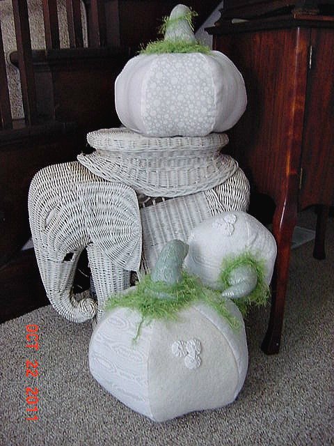 My white pumpkins. I created these with various textures and shades of white fabrics, including a velvet. The stem is made of a pale green brocade. The vines are made using a green eyelash yarn.